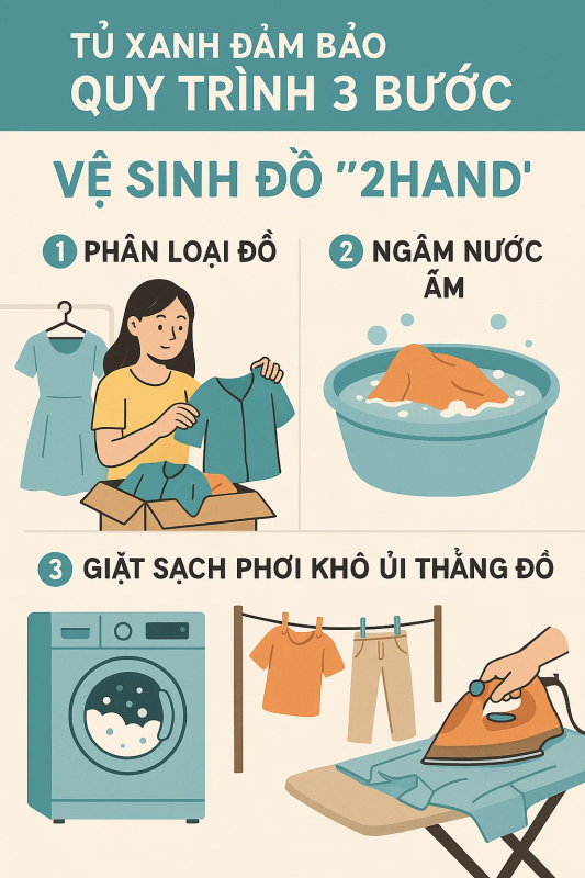 Đừng lo, vì làm sạch đồ secondhand không hề khó. Dưới đây là 3 bước làm sạch đồ 2hand đúng cách mà bạn có thể tự làm tại nhà – nhanh gọn, hiệu quả và an toàn cho da. Tủ Xanh cũng áp dụng quy trình này trong khâu xử lý sản phẩm trước khi gửi đến khách hàng.