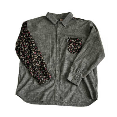 Điểm nổi bật của mẫu áo này nằm ở sự tương phản thú vị giữa phần thân áo màu xám trơn và tay áo, túi áo, cầu vai được phối bằng vải hoa nền đen. Họa tiết hoa nhỏ tông trầm mang hơi hướng retro, vintage, được bố trí khéo léo tạo điểm nhấn mà không gây rối mắt.